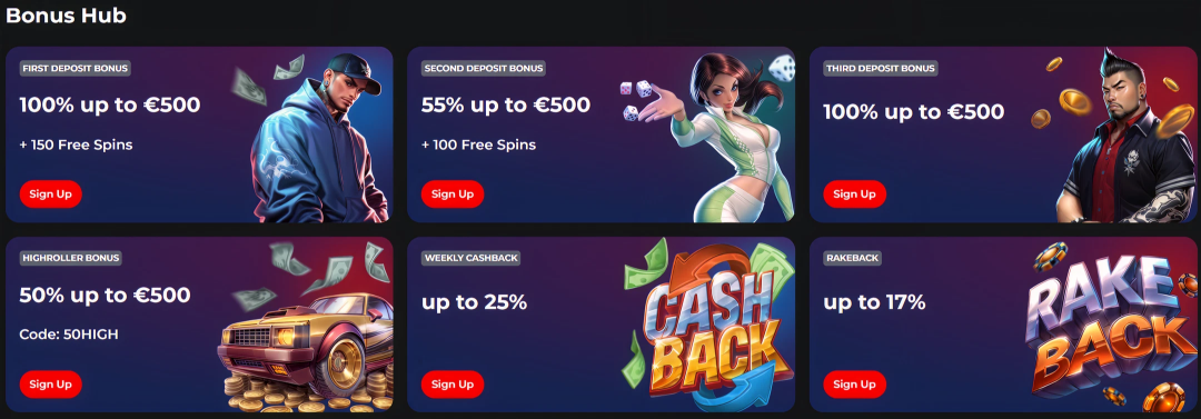 Nowoczesna witryna hazardowa z pewnością przyciąga uwagę także poprzez drogie promocje i dużą dostępność gier. Wartość pakietu powitalnego wynosi 1500 € oraz 250 darmowych spinów. Premiowane są również kolejne wpłaty, a gracze regularni mogą liczyć na dodatkowe nagrody.